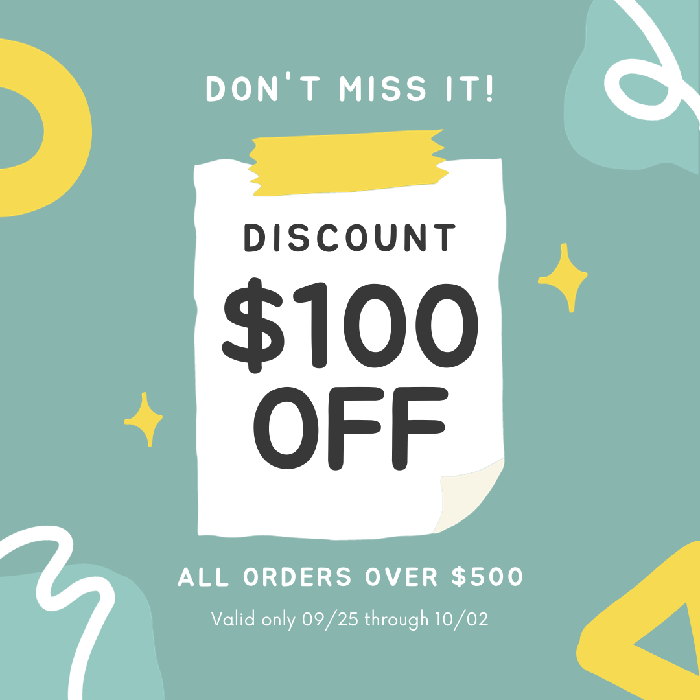 $100 OFF on all orders over $500 | 10% OFF on all smaller orders (no restrictions) + FREE SHIPPING on most orders over $100 (heavy item and equipment items excluded)