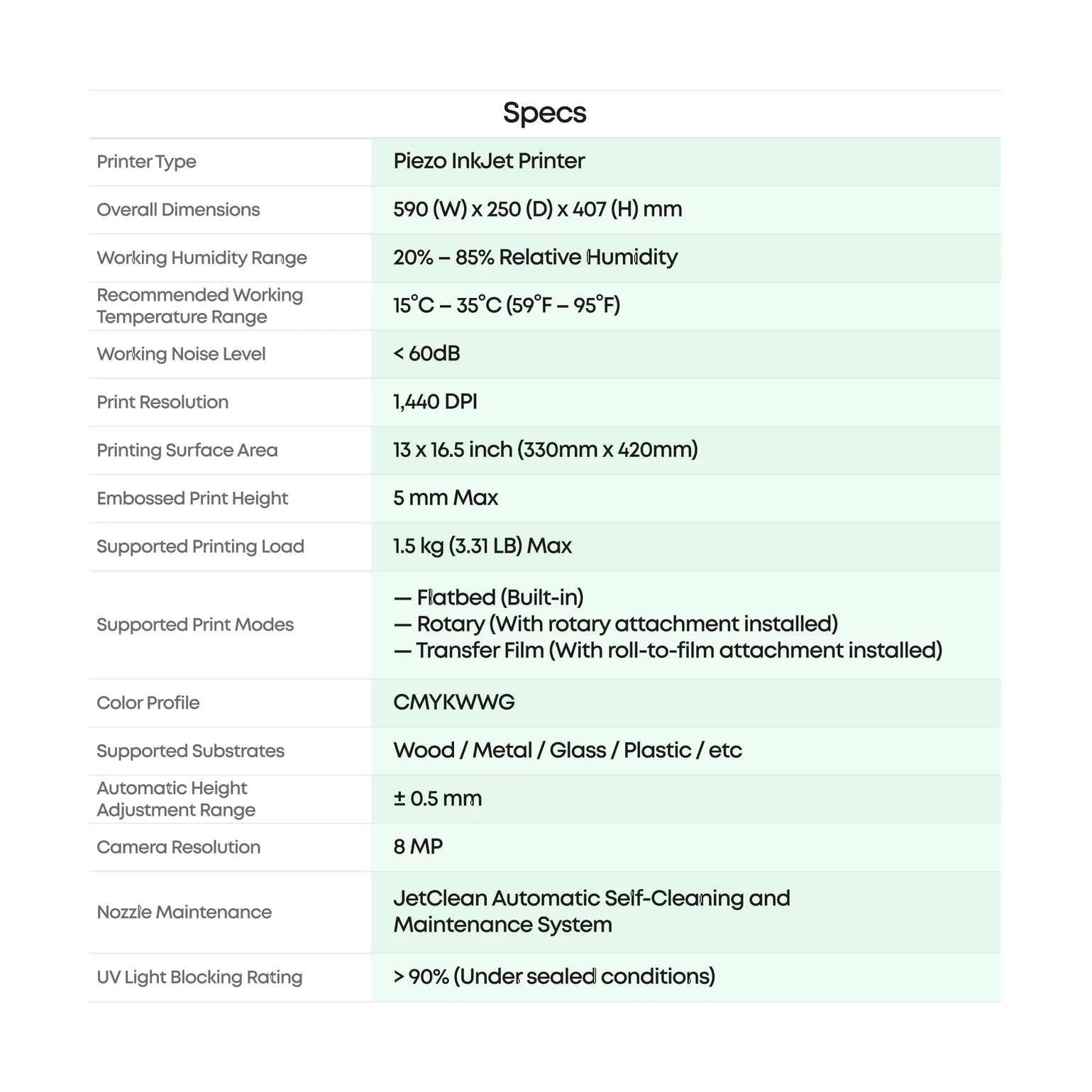 • Supported materials 300+ (wood, metal, acrylic, ceramic, glass, leather, fabric with flexible white, stone, and more)